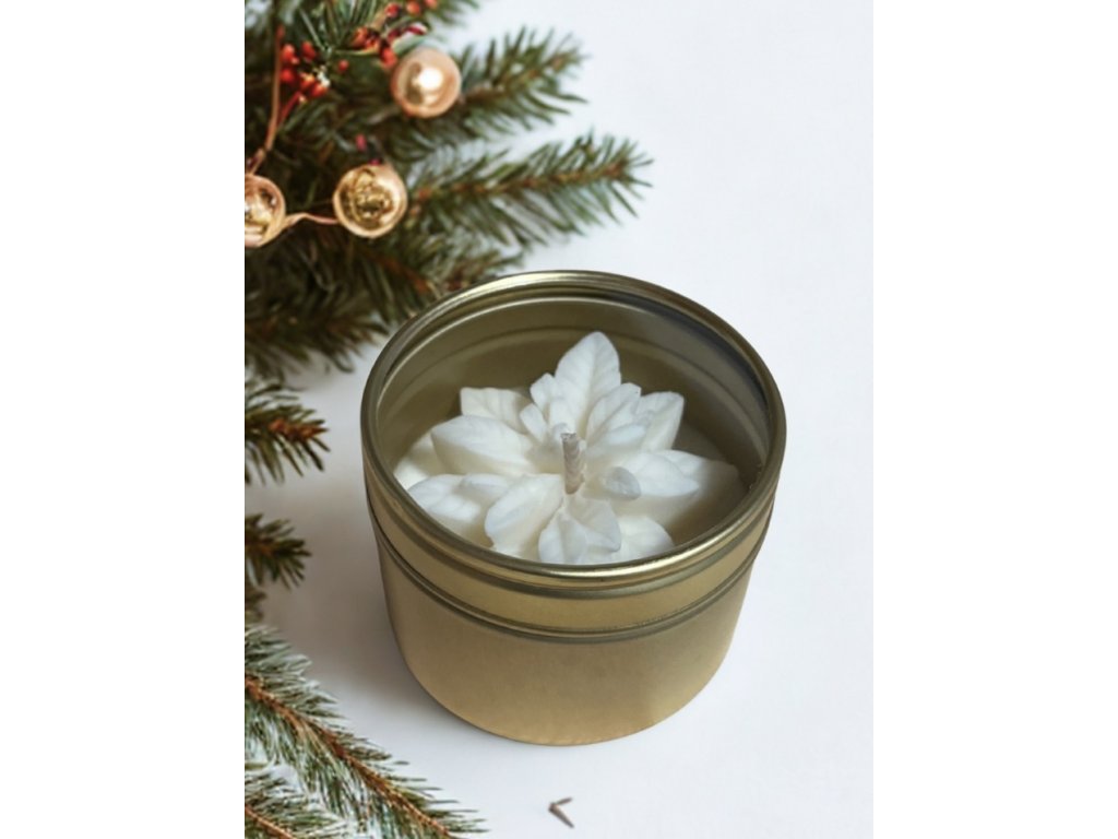- Sójovou svíčku v elegantní zlaté dóze s motivem vánoční hvězdy (100 ml). S jemnou kytičkou a vůní sladkého cukroví, která zútulní domov a přinese slavnostní atmosféru.