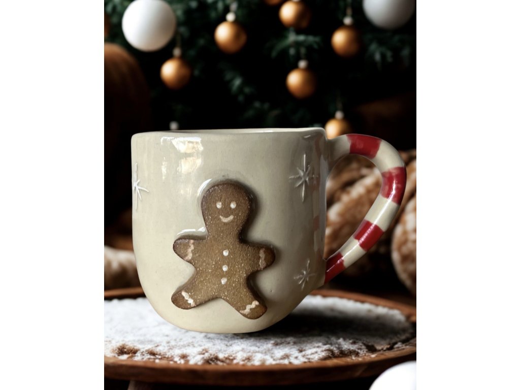 - Keramický hrnek Perníček (300 ml) – ruční originál s barevným uchem. Na hrnku se usmívá perníčkový panáček mezi sněhovými vločkami. Ideální společník na horký čaj nebo kakao.